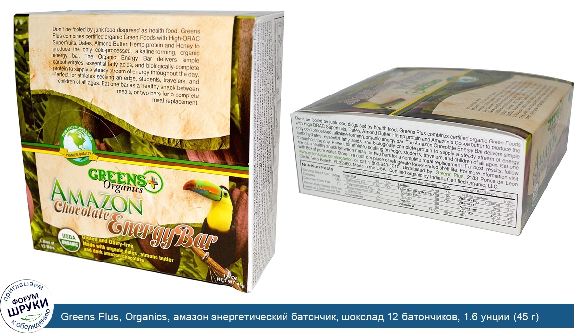 Greens Plus, Organics, амазон энергетический батончик, шоколад 12 батончиков, 1.6 унции (45 г) каждый