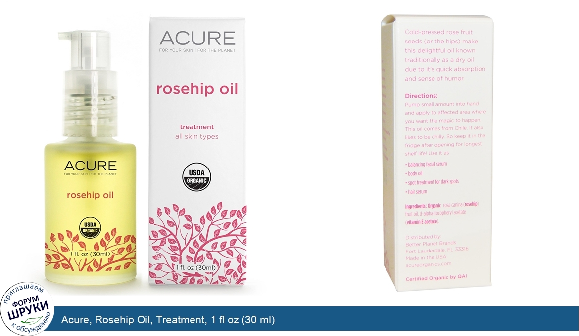 Друзья, если у вас есть отзыв/дополнение/комментарий/вопрос относительно Acure, Rosehip Oil, Treatment, 1 fl oz (30 ml) - напишите его ответом в эту тему (это будет полезно всему сообществу в целом и вам в отдельности).