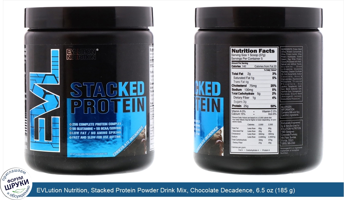 Друзья, если у вас есть отзыв/дополнение/комментарий/вопрос относительно EVLution Nutrition, Stacked Protein Powder Drink Mix, Chocolate Decadence, 6.5 oz (185 g) - напишите его ответом в эту тему (это будет полезно всему сообществу в целом и вам в отдельности).