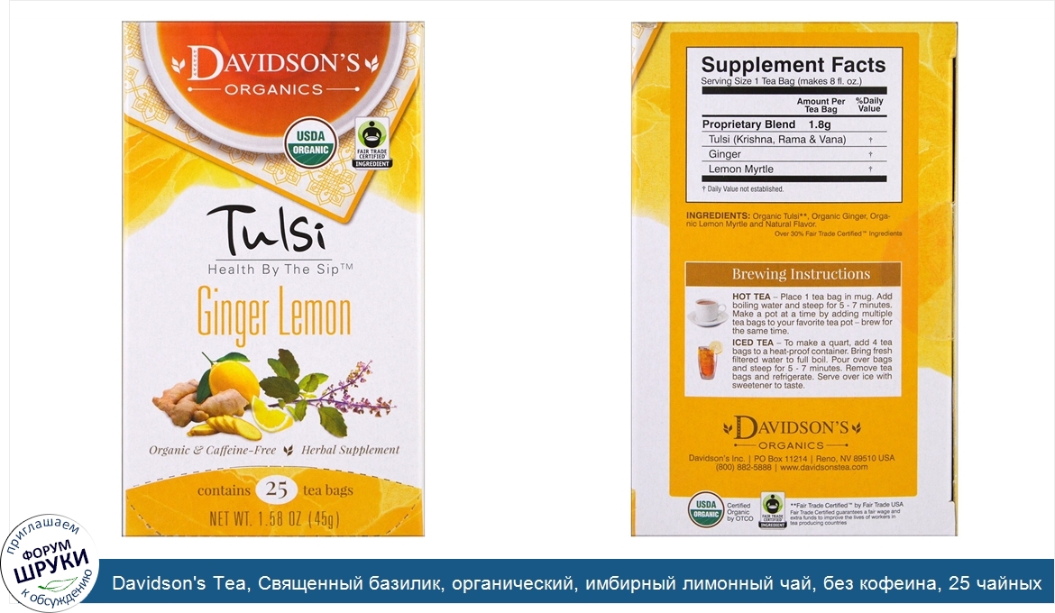 [DESCRIPT]Celebrating 40th Anniversary. Health by the Sip. Promotes Longevity and Enhances Wellbeing. Organic Caffeine-Free. Herbal Supplement. USDA Organic. Fair Trade Certified Ingredient. Contains 25 Tea Bags. Certified Organic by OTCO. Our philosophy remains the same since our journey began in 1976. We've worked tirelessly to develop blends that are true reflections of their names, while being committed to sourcing healthy ingredients grown by generations of skilled small farmers since the early 1900s engaging in sustainable, socially responsible agricultural practices. As the first exclusively organic tea purveyor, we bring you the finest fresh organic teas for the most discerning palates. Enjoy Davidson's Organics, the organic tea that sets the standards for the highest quality. Our Promise to You. While honoring your mind and body, we invite you to experience the great rewards of drinking tea when the flavors are true and exhilarating, and when ingredients are pure and uncompromised. So enjoy every sip of the purest organic tea, direct from our farm to your cup, and toast to our collective wellbeing together. Uniquely Davidson's. We grow our tea. We import our tea. We blend our tea. We package our tea. Tulsi Ginger Lemon. Davidson's blends three varieties of Tulsi (Krishna, Rama and Vana) with ginger (helps with motion sickness nausea) and lemon myrtle to create a delicious tartness with a kick if ginger spice. Tulsi, also known as Ocimum Sanctum, the Holy Basil or Tulasi, is a type of basil plant that has been grown for thousands of years. Since its introduction to society, Tulsi has become one of the cornerstones of Ayurvedic medicine. Tulsi is commonly cultivated for religious and spiritual purposes, and is recognized as the Elixir of Life. Additionally, Tulsi is widely enjoyed as an herbal tea and is well-known for its high antioxidant and adaptogenic properties. These properties promote wellness by strengthening the body's immune system against environmental and emotional influences. Lastly, due to its medicinal values, Tulsi is often used to treat various skin conditions, relieve stomach pains, promote blood circulation and reduce fever, just to name a few. **Fair Trade Certified.[/DESCRIPT]... (описание дополняется)