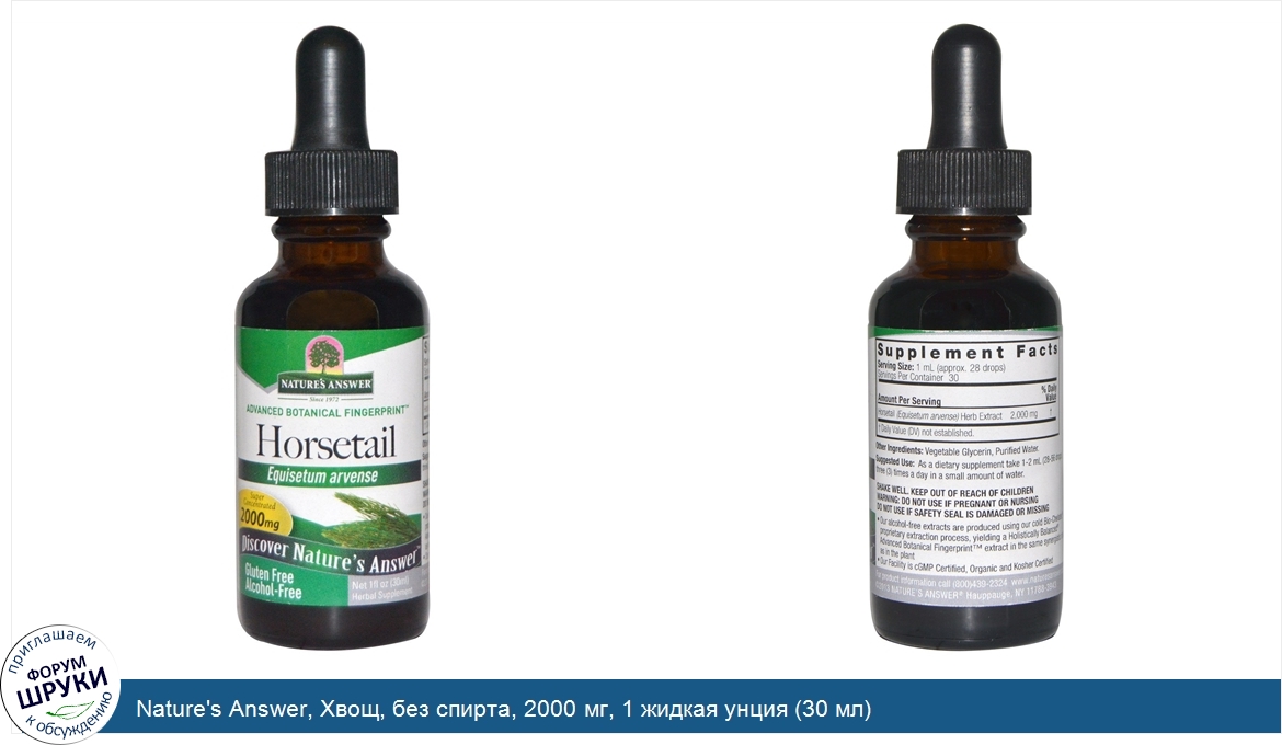 Друзья, если у вас есть отзыв/дополнение/комментарий/вопрос относительно Nature's Answer, Хвощ, без спирта, 2000 мг, 1 жидкая унция (30 мл) - напишите его ответом в эту тему (это будет полезно всему сообществу в целом и вам в отдельности).