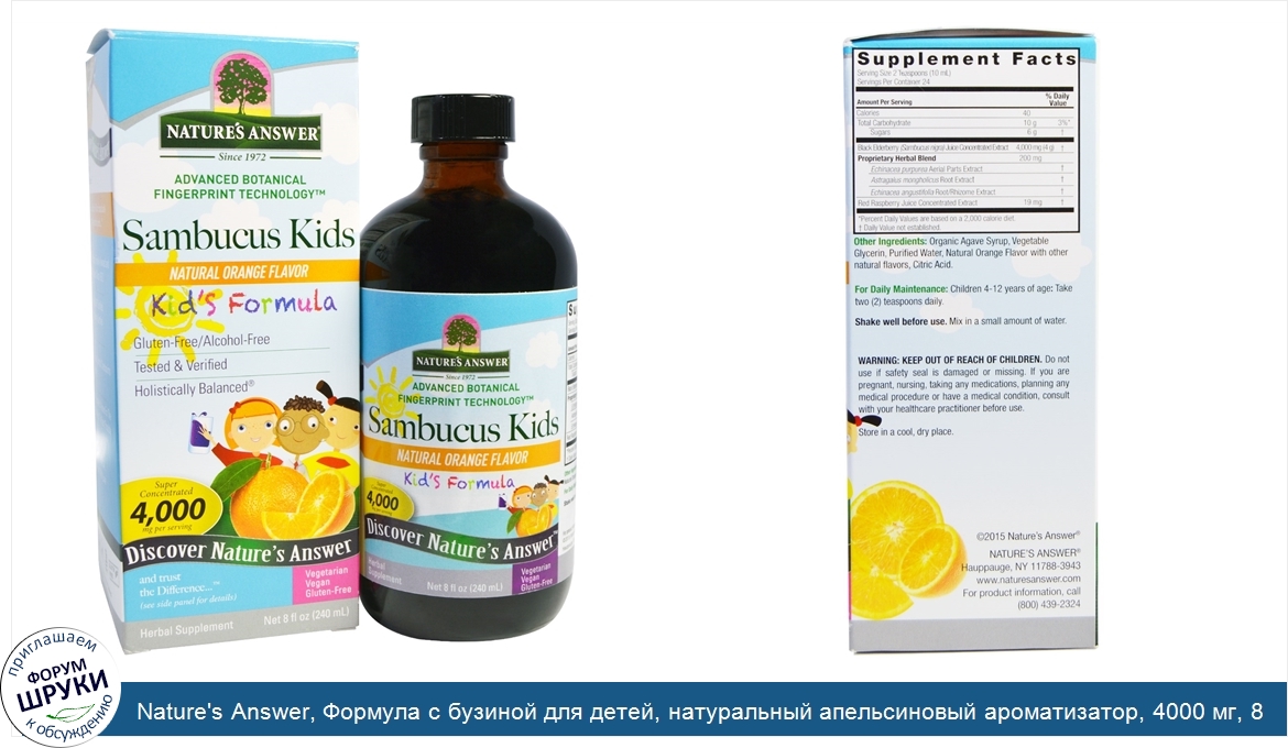 Друзья, если у вас есть отзыв/дополнение/комментарий/вопрос относительно Nature's Answer, Формула с бузиной для детей, натуральный апельсиновый ароматизатор, 4000 мг, 8 жидк. унц. (240 мл) - напишите его ответом в эту тему (это будет полезно всему сообществу в целом и вам в отдельности).