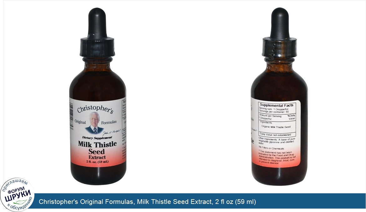 Друзья, если у вас есть отзыв/дополнение/комментарий/вопрос относительно Christopher's Original Formulas, Milk Thistle Seed Extract, 2 fl oz (59 ml) - напишите его ответом в эту тему (это будет полезно всему сообществу в целом и вам в отдельности).