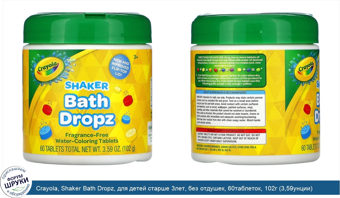 Друзья, если у вас есть отзыв/дополнение/комментарий/вопрос относительно Crayola, Shaker Bath Dropz, для детей старше 3лет, без отдушек, 60таблеток, 102г (3,59унции) - напишите его ответом в эту тему (это будет полезно всему сообществу в целом и вам в отдельности).