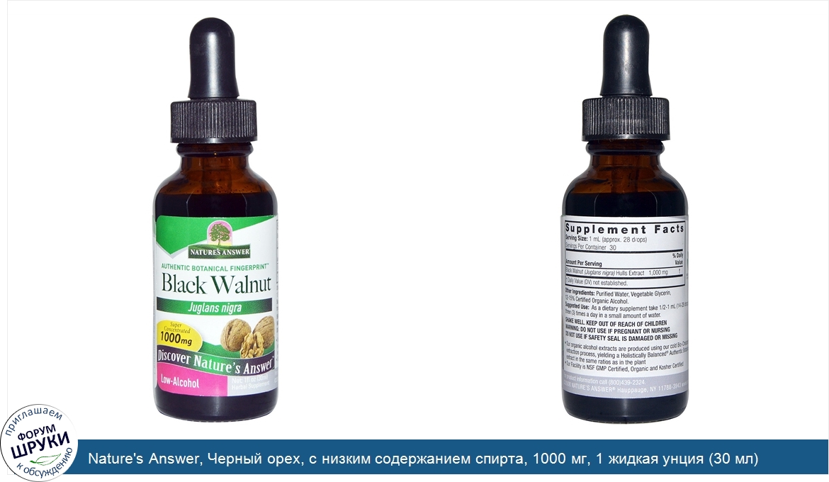 Друзья, если у вас есть отзыв/дополнение/комментарий/вопрос относительно Nature's Answer, Черный орех, с низким содержанием спирта, 1000 мг, 1 жидкая унция (30 мл) - напишите его ответом в эту тему (это будет полезно всему сообществу в целом и вам в отдельности).
