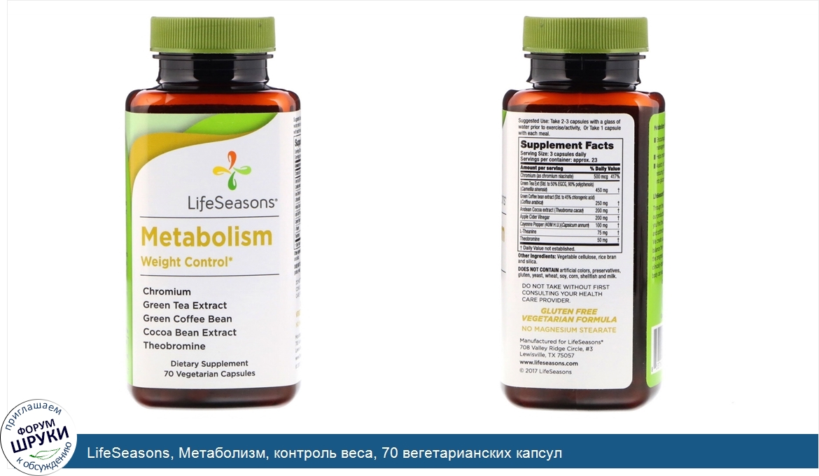 [DESCRIPT]Chromium. Green Tea Extract. Green Coffee Bean. Cocoa Bean Extract. Theobromine. Dietary Supplement. Vegetarian Formula. No Magnesium Stearate. Certified Gluten-Free. Metabolism. Weight Control. Encourages healthy weight management. Helps manage appetite. Assists in dietary management by reducing the breakdown of starch into glucose. LifeSeasons. Formulated for Life. Through the purity and potency of our products. LifeSeasons helps you find the balance between value and optimum health. We create supplement formulas that balance the wisdom of nature and the progress of science, using clinically-tested nutrients that the body can easily absorb. Metabolism boosts energy and promotes healthy weight control by managing appetite and supporting metabolism. Chromium. - Helps the body process carbohydrates and fats. Green Tea Extract. -Shown to increase fat burning and alertness. Green Coffee Bean. - Natural source of caffeine and chlorogenic acid. Cocoa Bean Extract. - Supports the nervous system, promotes fat burning, improves energy levels and mood. Theobromine. - Shown to be a weight loss aid and appetite suppressant.[/DESCRIPT]... (описание дополняется)