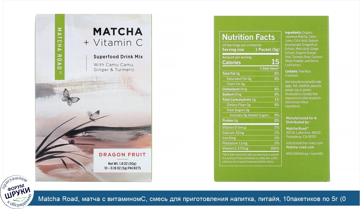 Matcha Road, матча с витаминомС, смесь для приготовления напитка, питайя, 10пакетиков по 5г (0,18унции)