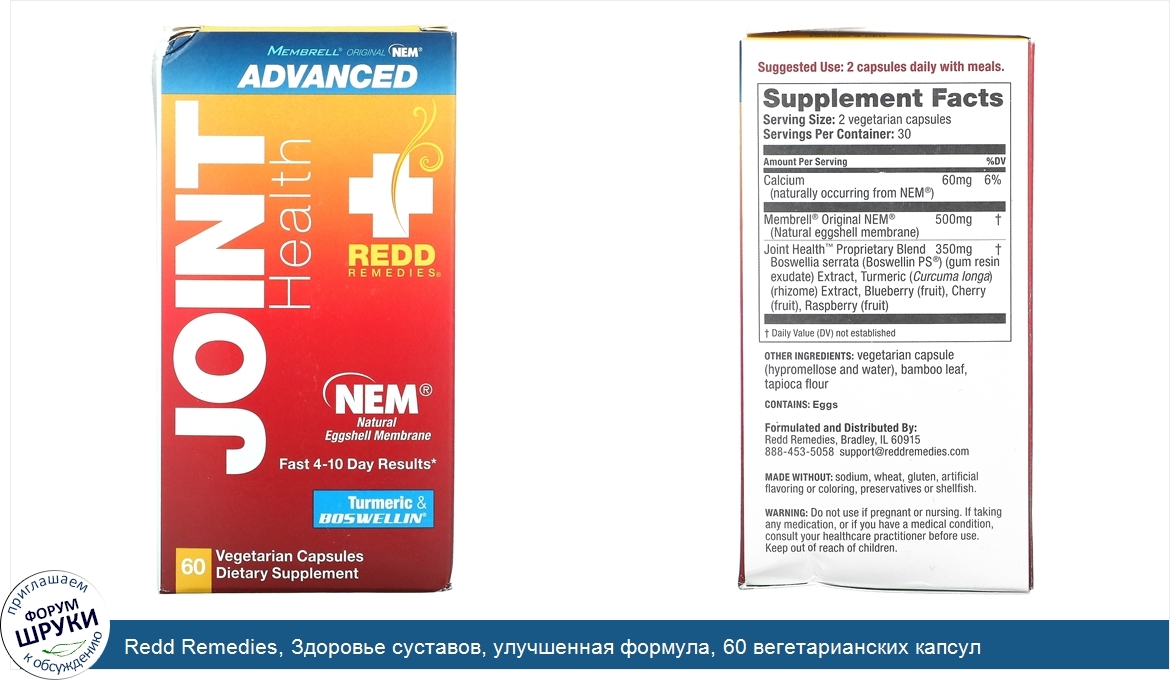 Друзья, если у вас есть отзыв/дополнение/комментарий/вопрос относительно Redd Remedies, Здоровье суставов, улучшенная формула, 60 вегетарианских капсул - напишите его ответом в эту тему (это будет полезно всему сообществу в целом и вам в отдельности).