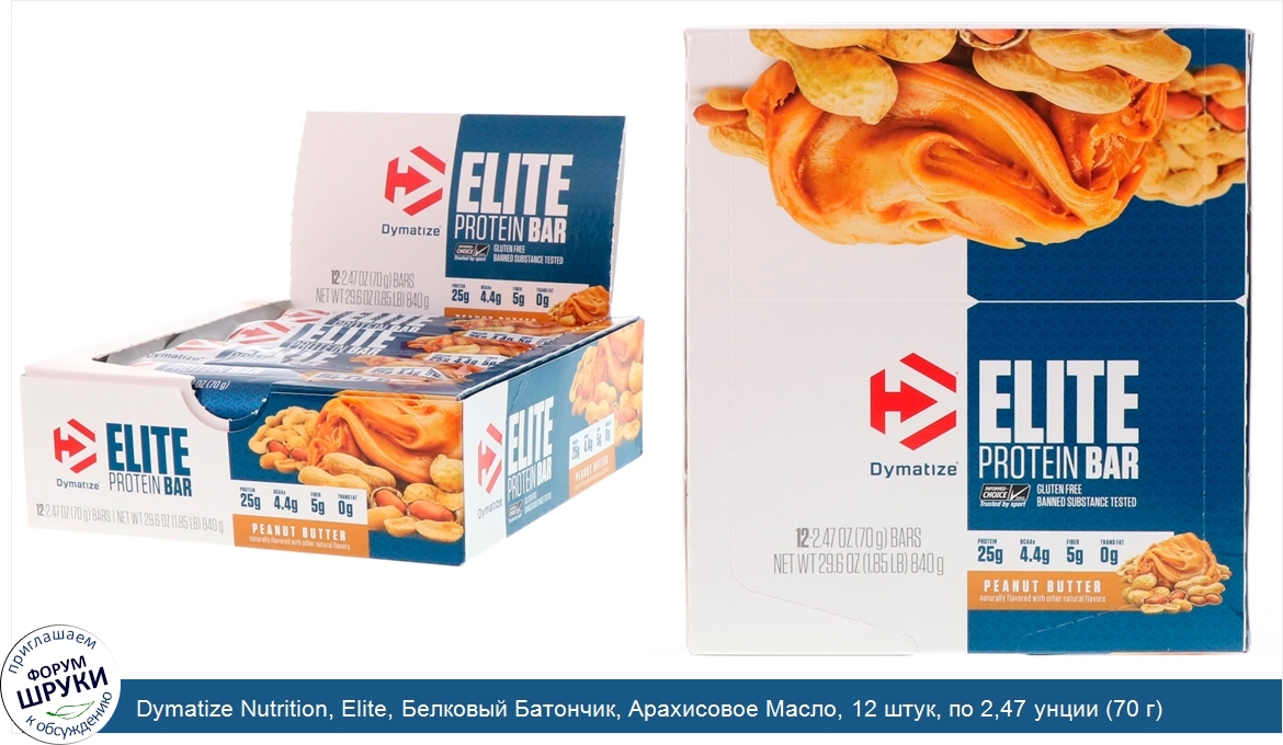 Dymatize Nutrition, Elite, Белковый Батончик, Арахисовое Масло, 12 штук, по 2,47 унции (70 г) каждая