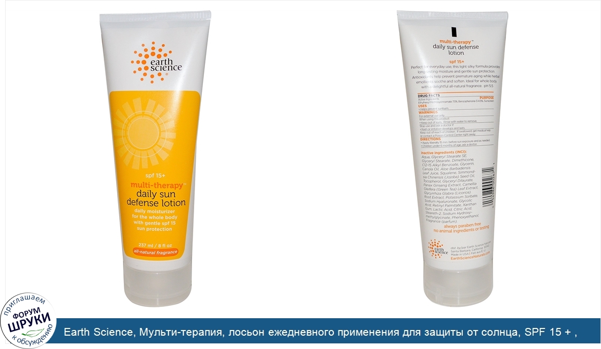 Earth Science, Мульти-терапия, лосьон ежедневного применения для защиты от солнца, SPF 15 + , Натуральные ароматы 8 жидких унции (237 мл)