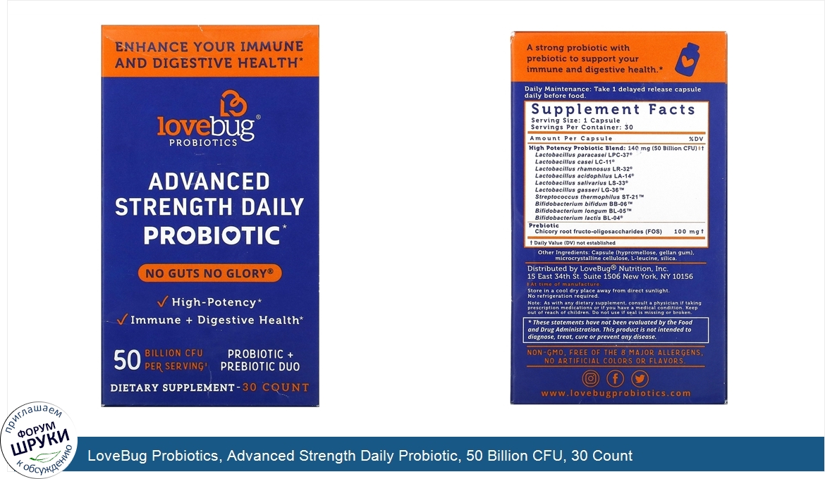 Друзья, если у вас есть отзыв/дополнение/комментарий/вопрос относительно LoveBug Probiotics, Advanced Strength Daily Probiotic, 50 Billion CFU, 30 Count - напишите его ответом в эту тему (это будет полезно всему сообществу в целом и вам в отдельности).