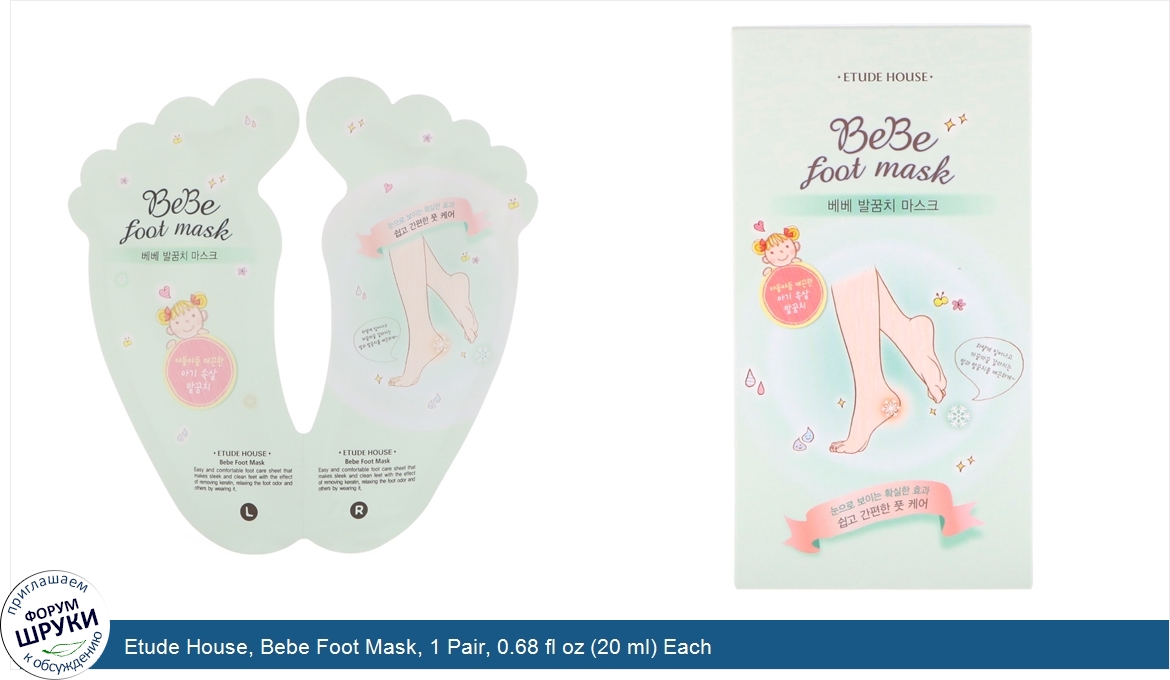 Друзья, если у вас есть отзыв/дополнение/комментарий/вопрос относительно Etude House, Bebe Foot Mask, 1 Pair, 0.68 fl oz (20 ml) Each - напишите его ответом в эту тему (это будет полезно всему сообществу в целом и вам в отдельности).