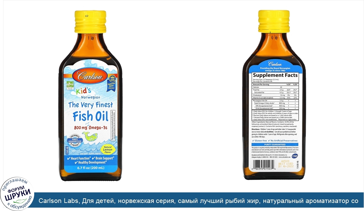 Друзья, если у вас есть отзыв/дополнение/комментарий/вопрос относительно Carlson Labs, Для детей, норвежская серия, самый лучший рыбий жир, натуральный ароматизатор со вкусом лимона, 800мг, 200мл (6,7жидкойунции) - напишите его ответом в эту тему (это будет полезно всему сообществу в целом и вам в отдельности).