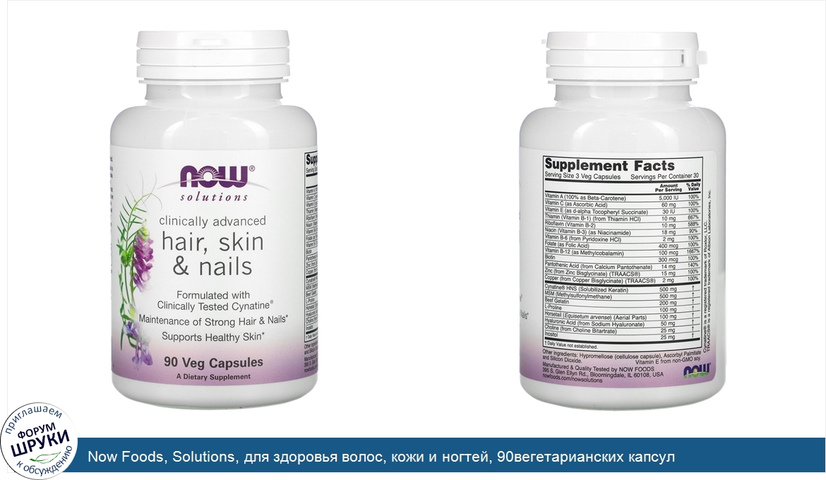 . Содержит клинически протестированный Cynatine®. Поддерживающий уход для волос и ногтей. Поддерживает здоровье кожи. Пищевая добавка. Продукт NOW® Solutions создан для питания и поддержания здоровья волос, кожи ...