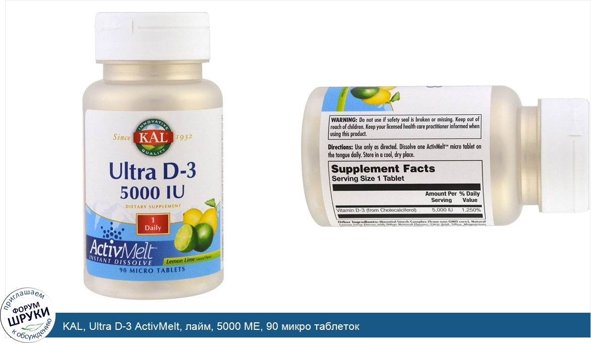 [DESCRIPT]Melts Fast, Flavor Lasts. Since 1932. Innovative Quality. Dietary Supplement. 1 Daily. ActivMelt - Instant Dissolve. KAL D-3 5000 IU ActivMelt micro tablets melt quickly in the mouth and are designed for optimal absorption in the body. The natural Lemon Lime flavor is a tasty bonus. Vitamin D is intended to provide nutritive support for normal, healthy formation of the skeleton and for mineral homeostasis.[/DESCRIPT]... (описание дополняется)