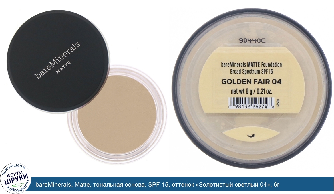 bareMinerals, Matte, тональная основа, SPF 15, оттенок «Золотистый светлый 04», 6г