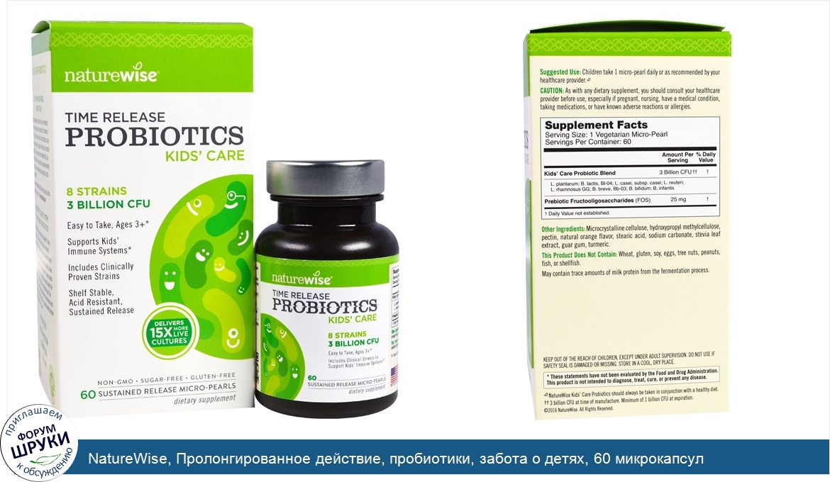 [DESCRIPT]8 штаммов — 3 миллиарда КОЕ. Легко употреблять, от 3 лет. Поддерживает детский иммунитет. Включает штаммы с клинически доказанной эффективностью. Можно хранить не в холодильнике, устойчиво к кислоте, замедленное высвобождение. В 15 раз больше живых культур. Не содержит ГМО. Без сахара. Не содержит глютена. Пищевая добавка. Живите здоровыми. Живите счастливыми. Крохотные и удобные в употреблении. Защита от желудочной кислоты. Пробиотики для детей. Одна крохотная горошинка, простая в употреблении. В школе и во время игры дети ежедневно сталкиваются с факторами риса для иммунной системы. Баланс "хорошей" микрофлоры кишечника может нарушиться из-за диеты со слишком высоким содержанием сахара или низким содержанием клетчатки, или же из-за приема определенных лекарств. NatureWise Kids' Care всего в одной крохотной горошинке содержит 8 штаммов полезных для детей пробиотиков для поддержания здорового пищеварения, улучшенной впитываемости питательных веществ и поддержания иммунитета ребенка. Система высвобождения Wisebiotics: отлично подходит и детям! . Наша система высвобождения активных веществ WiseBiotics защищает и доставляет в нижний отдел кишечника вашего ребенка в 15 раз больше живых культур, чем стандартные капсулы или желе с пробиотиками — и все они содержатся в одной маленькой горошинке! Желудочная кислота может уничтожить до 96% стандартных пробиотиков, прежде чем они достигнут нижнего отдела кишечника. Наша система высвобождения WiseBiotics гарантирует, что пробиотик не только перенесет путь в кишечник, но и будет постепенно высвобождать живые активные культуры в течение продолжительного периода времени, поддерживая функцию кишечника и иммунитет вашего ребенка — существенное преимущество, отсутствующее у стандартных пробиотиков.[/DESCRIPT]... (описание дополняется)