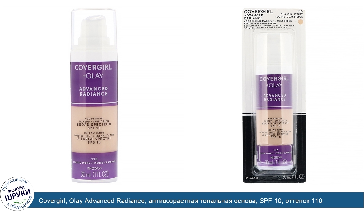 ru Covergirl, Olay Advanced Radiance, антивозрастная тональная основа, SPF 10, оттенок 110 «Классическая слоновая кость», 30мл (1 жидк.унция)