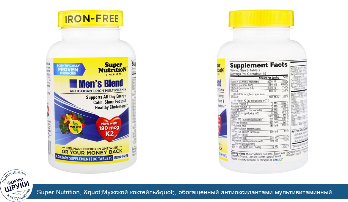 Друзья, если у вас есть отзыв/дополнение/комментарий/вопрос относительно Super Nutrition, "Мужской коктейль", обогащенный антиоксидантами мультивитаминный комплекс для мужчин, без железа, 90 таблеток - напишите его ответом в эту тему (это будет полезно всему сообществу в целом и вам в отдельности).