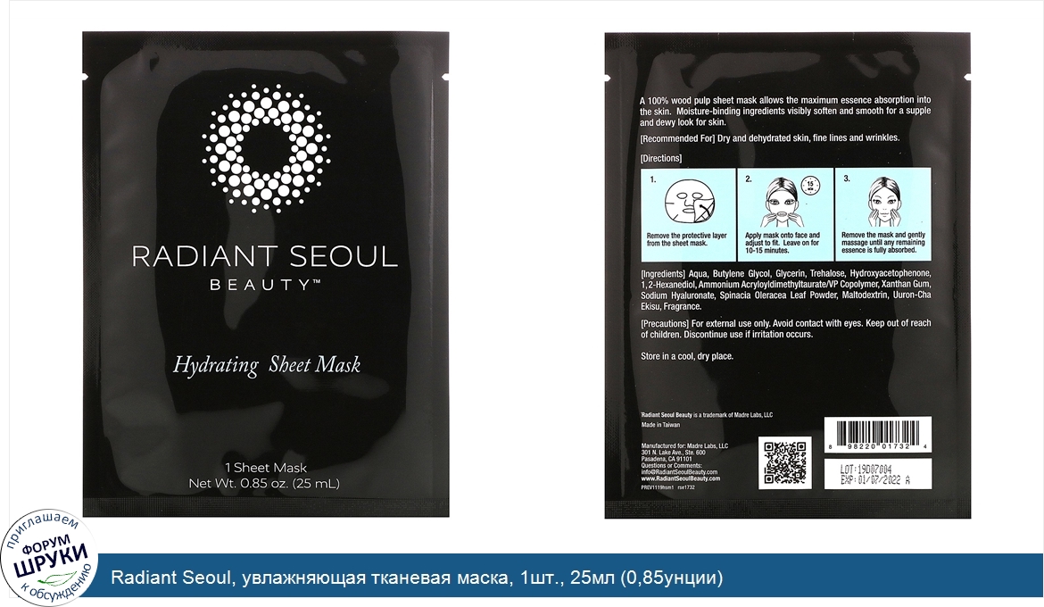 Radiant Seoul, увлажняющая тканевая маска, 1шт., 25мл (0,85унции)