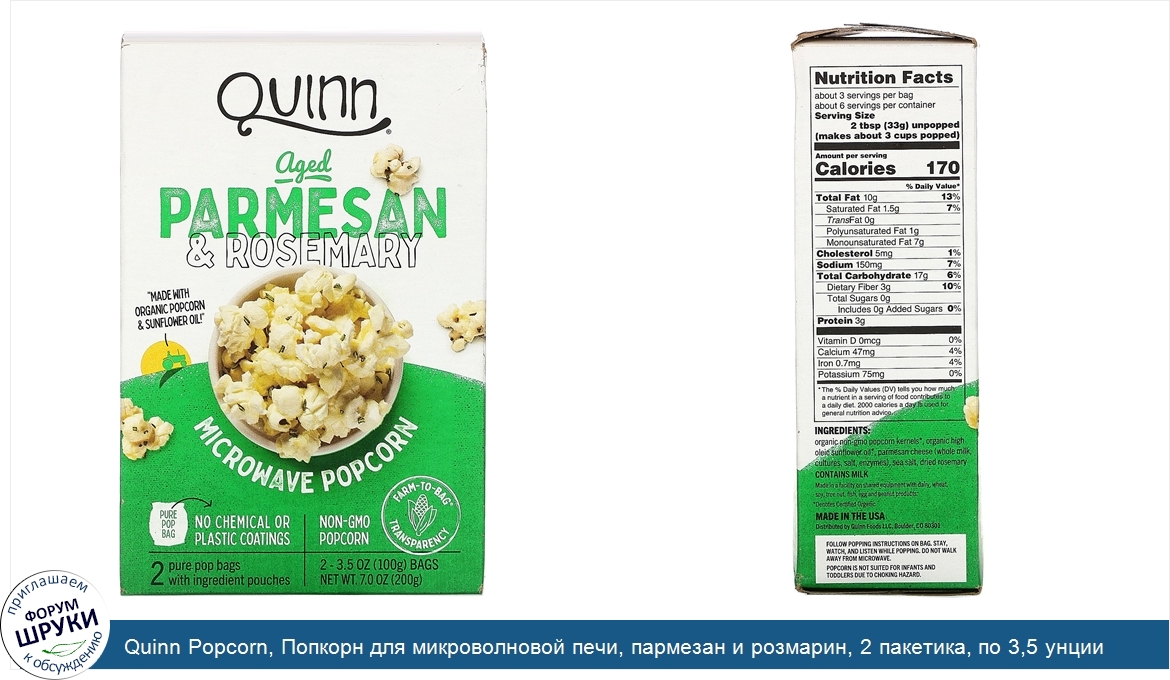 Quinn Popcorn, Попкорн для микроволновой печи, пармезан и розмарин, 2 пакетика, по 3,5 унции (100 г) каждый