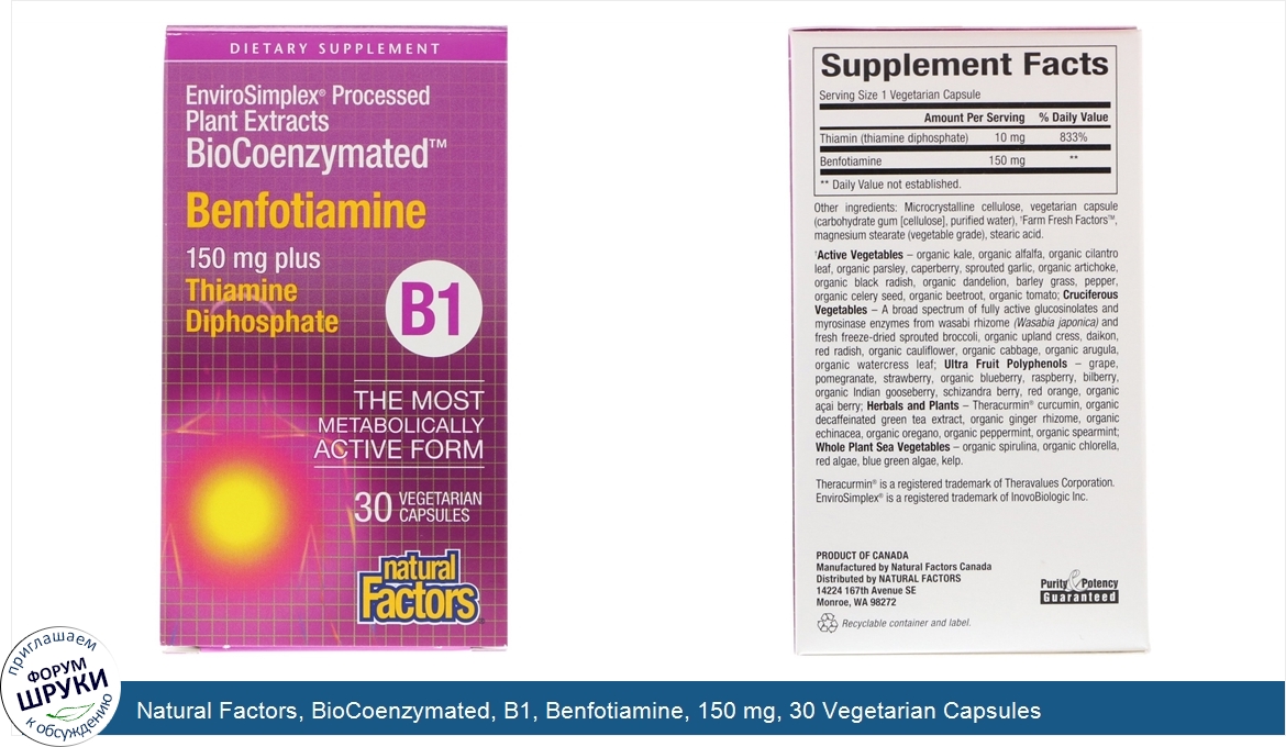 Друзья, если у вас есть отзыв/дополнение/комментарий/вопрос относительно Natural Factors, BioCoenzymated, B1, Benfotiamine, 150 mg, 30 Vegetarian Capsules - напишите его ответом в эту тему (это будет полезно всему сообществу в целом и вам в отдельности).
