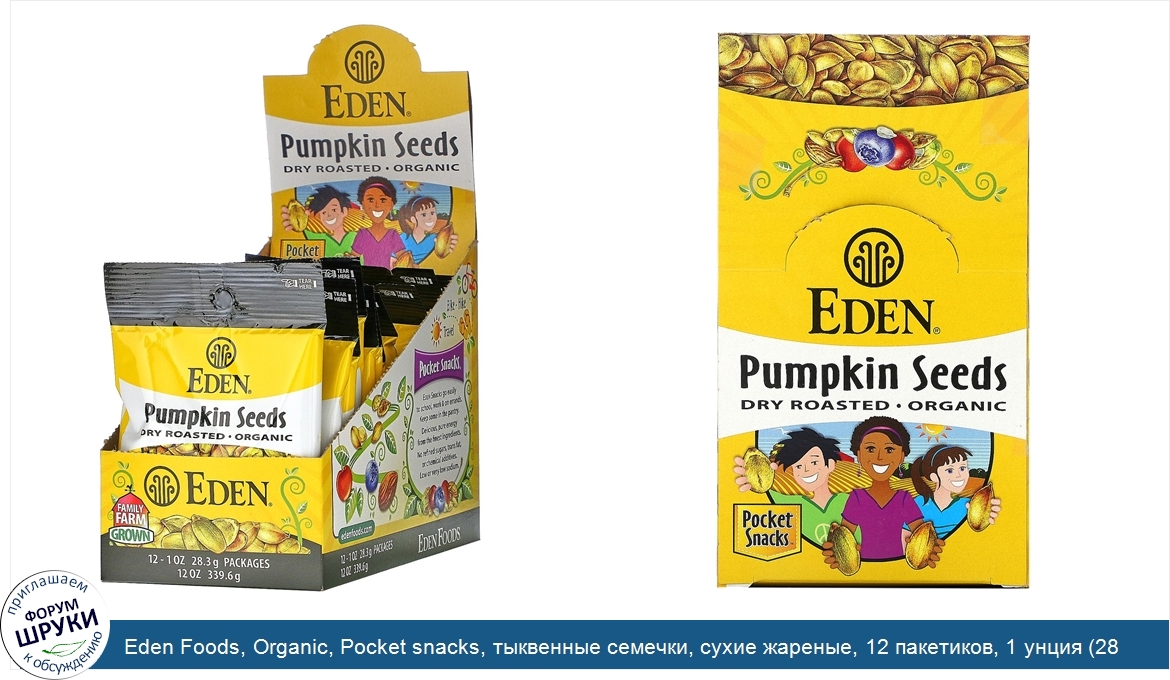 ru Eden Foods, Organic, Pocket snacks, тыквенные семечки, сухие жареные, 12 пакетиков, 1 унция (28,3 г) каждый