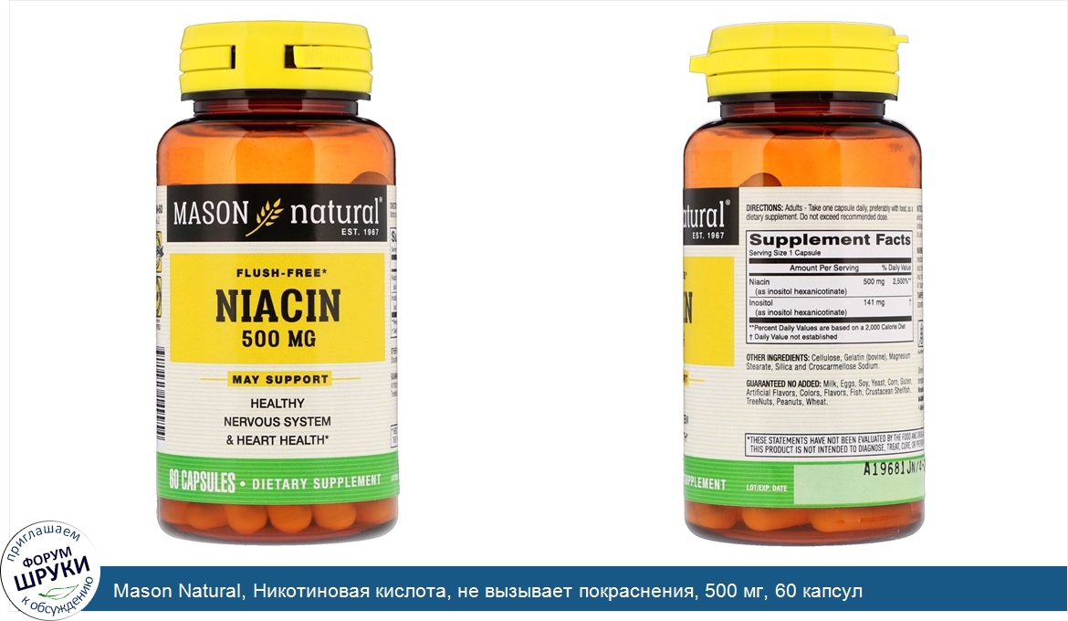 [DESCRIPT]Flush Free*. May Support Healthy Nervous System Heart Health. Mason Guarantee Laboratory Tested. cGMP Certified. Dietary Supplement. Gluten Free. Soy Free. Note: *Most people should not experience flushing when using this product. However, a few sensitive individuals may experience some flushing. Do not take on an empty stomach.[/DESCRIPT]... (описание дополняется)