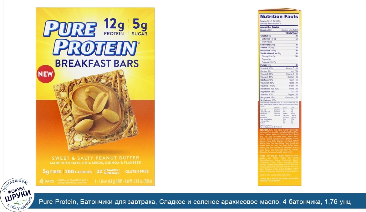 [DESCRIPT]Deliciously Soft and Chewy! . 12 g Protein | 5 g Sugar. Made with Oats, Chia Seeds, Quinoa Flaxseed. 5 g Fiber | 200 Calories | 22 Vitamins + Minerals | Gluten Free. Naturally Flavored with Other Natural Flavors. Use as part of a balanced breakfast. Protein. Fiber. Whole Grains. 22 Vitamins Minerals. One Pure Protein Breakfast Bar Has. 50% more protein than 1 cup of milk¹. 100% more protein than 1 large egg². 100% more protein than 1 cup of cooked oats. Excellent Source of Fiber - No High Fructose Corn Syrup. ¹Pure Protein Breakfast Bar has 12 g protein per serving: 1 cup of milk contains 8 g protein. ²Pure Protein Breakfast Bar has 12 g protein per serving: One large egg contains 6 g protein. ³Pure Protein Breakfast Bar has 12 g protein per serving: 1 cup of cooked oats contains 6 g protein.[/DESCRIPT]... (описание дополняется)
