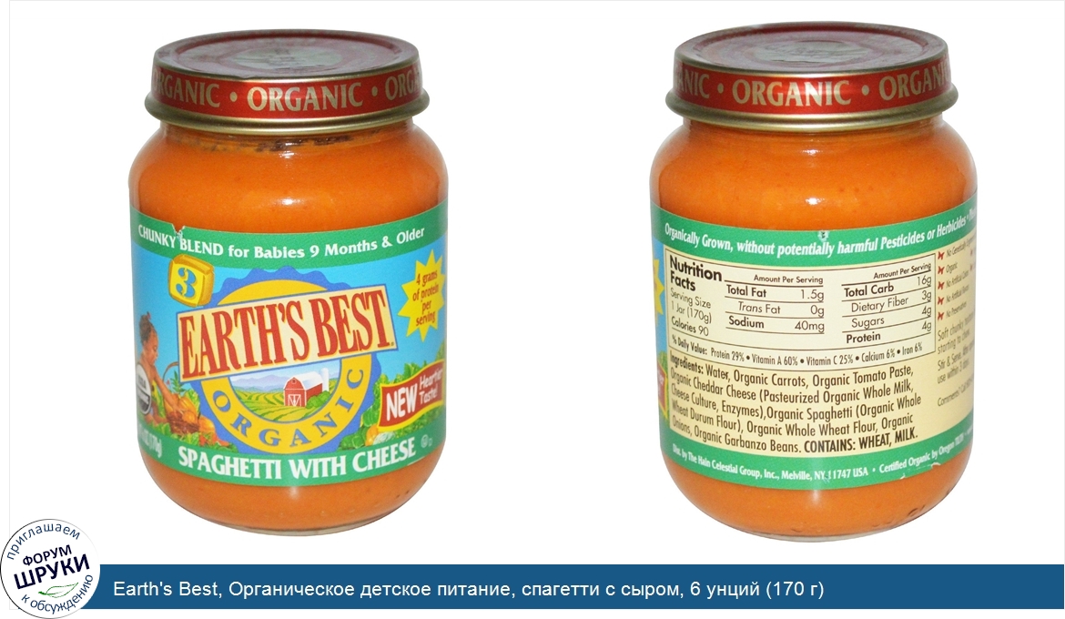 Друзья, если у вас есть отзыв/дополнение/комментарий/вопрос относительно Earth's Best, Органическое детское питание, спагетти с сыром, 6 унций (170 г) - напишите его ответом в эту тему (это будет полезно всему сообществу в целом и вам в отдельности).