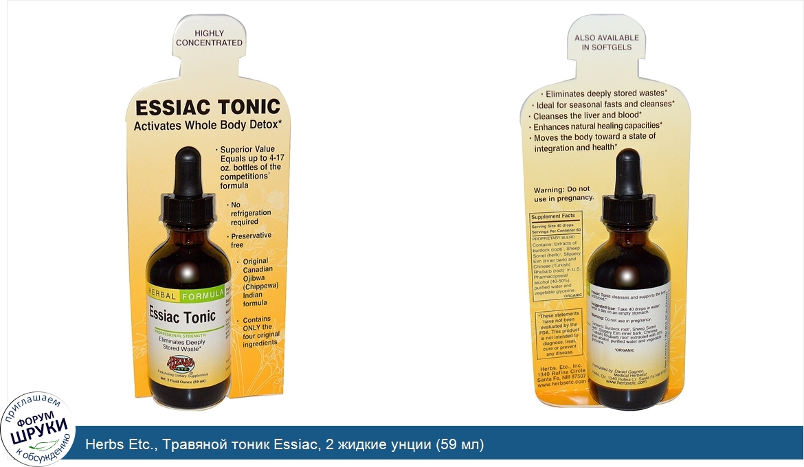 Друзья, если у вас есть отзыв/дополнение/комментарий/вопрос относительно Herbs Etc., Травяной тоник Essiac, 2 жидкие унции (59 мл) - напишите его ответом в эту тему (это будет полезно всему сообществу в целом и вам в отдельности).