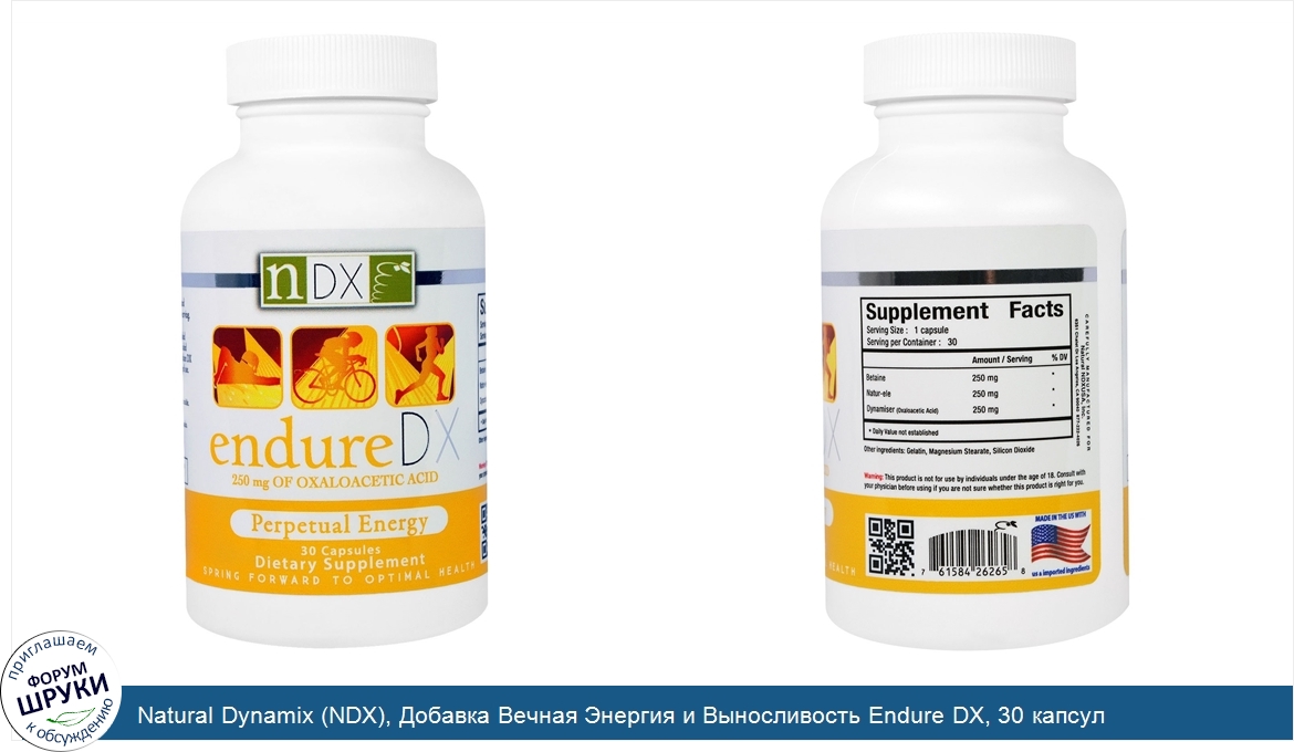 Natural Dynamix (NDX), Добавка Вечная Энергия и Выносливость Endure DX, 30 капсул