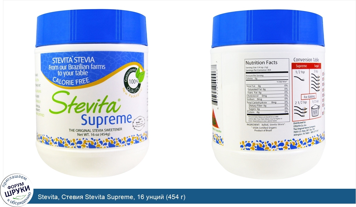 Друзья, если у вас есть отзыв/дополнение/комментарий/вопрос относительно Stevita, Стевия Stevita Supreme, 16 унций (454 г) - напишите его ответом в эту тему (это будет полезно всему сообществу в целом и вам в отдельности).
