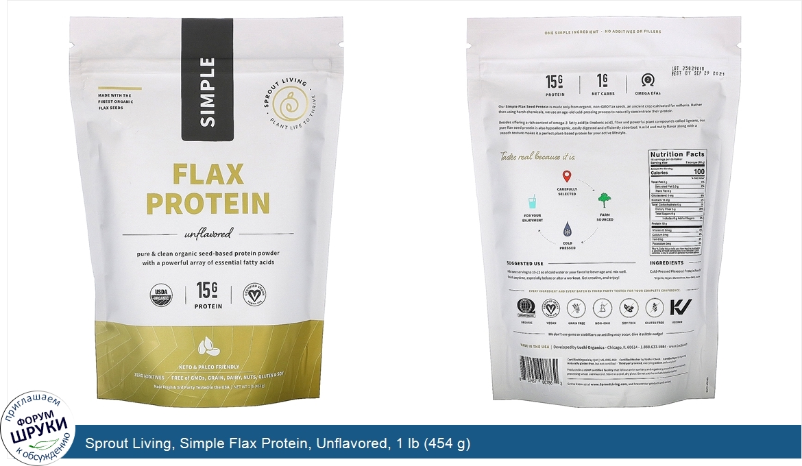 [DESCRIPT]Sprout Living. Plant Life to Thrive. USDA Organic. 15 g Protein. Certified Vegan. Made with the Finest Organic Flax Seeds. Keto Paleo Friendly. Zero Additives. Free of GMOs , Grain, Dairy, Nuts, Gluten Soy. Made Fresh 3rd Party Tested in the USA. One Simple Ingredient - No Additives or Fillers. 1 g Net Carbs. Omega EFAs. Non-GMO. Soy Free. Gluten Free. Kosher. Certified Organic by QAI. Certified Kosher by Kosher Check. Certified Vegan by Vegan.org. Naturally Gluten Free, but Not Certified. Pure Clean Organic Seed-Based Protein Powder with a Powerful Array of Essential Fatty Acids. Our Simple Flax Seed Protein is made only from organic, non-GMO flax seeds, an ancient crop cultivated for millennia. Rather than using harsh chemicals, we use an age-old cold-pressing process to naturally concentrate their protein. Besides offering a rich-content of omega-3 fatty acid (a-linolenic acid), fiber and powerful plant compounds called lignans, our pure flax seed protein is also hypoallergenic, easily digested and efficiently absorbed. A mild and nutty flavor along with a smooth texture makes it a perfect plant-based protein for your active lifestyle. Taste real because it is. Carefully Selected. Farm Sourced. Cold Pressed. For Your Enjoyment. Every ingredient and every batch is third party tested for your complete confidence.[/DESCRIPT]... (описание дополняется)