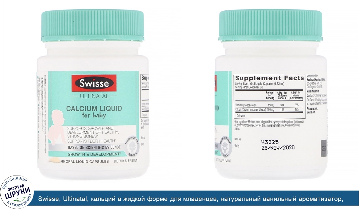 Swisse, Ultinatal, кальций в жидкой форме для младенцев, натуральный ванильный ароматизатор, 60капсул с жидкостью для орального применения