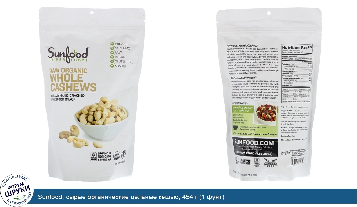 Друзья, если у вас есть отзыв/дополнение/комментарий/вопрос относительно Sunfood, сырые органические цельные кешью, 454 г (1 фунт) - напишите его ответом в эту тему (это будет полезно всему сообществу в целом и вам в отдельности).