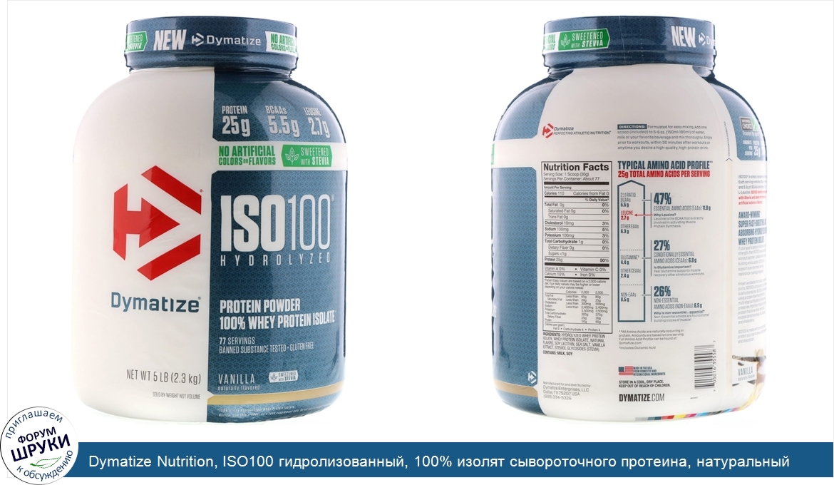 [DESCRIPT]Без искусственных красителей и вкусовых добавок. Подслащено стевией. Белок — 25 г. Аминокислоты с разветвленной цепью — 5,5 г. Лейцин — 2,7 г. Протеиновый порошок. 100% белкового изолята*. 77 порций. Подтверждено отсутствие запрещенных веществ + не содержит глютена. Натуральные вкусовые добавки. Dymatize — совершенствование питания для физической активности. Употребляйте Dymatize. Стандартный профиль аминокислот**. 25 г аминокислот на порцию. 47% незаменимых аминокислот: 11,8 г. Соотношение 2:1:1 аминокислоты с разветвленной цепью - 5,5 г. Лейцин - 2,7 г -. Почему лейцин? Лейцин — это аминокислота с разветвленной цепью, которая непосредственно участвует в активации синтеза мышечных белков. Другие незаменимые аминокислоты — 6,3 г. 27% условно незаменимых аминокислот: 6,8 г. Глутамин. †. - 4,4 г -. Важен ли глутамин? Да! Глутамин поддерживает восстановление мышц после интенсивных тренировок. Другие условное незаменимые — 2,4 г. 26% заменимых аминокислот: 6,5 г. Заменимые аминокислоты - 6,5 г -. Почему заменимые аминокислоты важны? Заменимые аминокислоты являются основным строительным материалом для роста мышечной ткани! Informed-Choice — нам доверяют спортсмены. Informed-Choice — это программа гарантии качества, т.е. все пищевые добавки и/или ингредиенты, на которые нанесен логотип Informed-Choice, успешно прошли проверку на отсутствие запрещенных веществ, проведеннную ведущими антидопинговыми лабораториями мира. Количества на порцию. Калории — 110. Углеводы — 1 г. Жиры — 0 г. Сахар — 1 г. Лактоза — 0 г. ISO100 — это просто топливо для наращивания мышечной массы. Каждая порция содержит 25 г белка и 5,5 г аминокислот с разветвленной цепью включая 2,7 г L-лейцина. Натуральная ваниль ISO100 подслащена стевией и не содержит искусственных ароматизаторов и красителей. Ультрачистый, исключительно быстро усваиваемый и абсорбирующийся гидролизованный 100% изолят сывороточного белка. Если ваша цель — увеличение мышечной массы и силы, тогда ISO100 — ваш идеальный «партнер» для тренировок. Насыщенный аминокислотами для наращивания мышц ISO 100 может поддерживать даже самые серьезные тренировочные программы. Известный во всем мире своим качеством, вкусом и чистотой, ISO100 производится в соответствии с самыми высокими стандартами качества. Формула ISO100 разработана с использованием микрофильтрации с перекрестным потоком, многоступенчатой очистки, после которой сохраняются важные белковые фракции и исчезают избыточные углеводы, жиры, лактоза и холестерин. ISO100 производится с использованием предварительно гидролизованного белка, обеспечивающего быстрое пищеварение и всасывание. Натуральная ваниль ISO100 — это идеальный белок для употребления перед тренировкой, после тренировки и в любое время. Реальные научные разработки и качество. Протеины Dymatize производятся на основе последних достижений науки и подвергаются испытаниям в элитных профессиональных тренировочных центрах. Белковые смеси Dymatize производятся в соответствии со стандартами GMP и Sport Certified, что позволяет гарантировать, что все ингредиенты и готовый продукт проходят тщательную проверку на чистоту и безопасность. Это позволяет гарантировать отсутствие любых веществ, запрещенных Informed-Choice. Этика протеина Dymatize. 100% протеина, заявленного на порцию, получено из высококачественных, чистых, нетронутых протеинов. Мы не завышаем содержание аминокислот в на