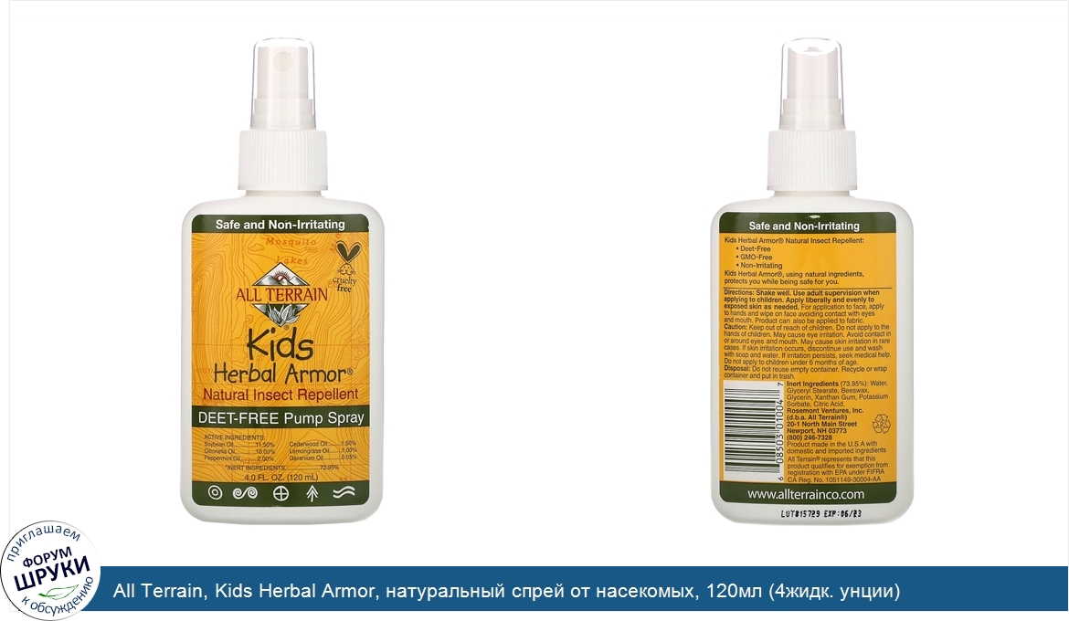 Друзья, если у вас есть отзыв/дополнение/комментарий/вопрос относительно All Terrain, Kids Herbal Armor, натуральный спрей от насекомых, 120мл (4жидк. унции) - напишите его ответом в эту тему (это будет полезно всему сообществу в целом и вам в отдельности).