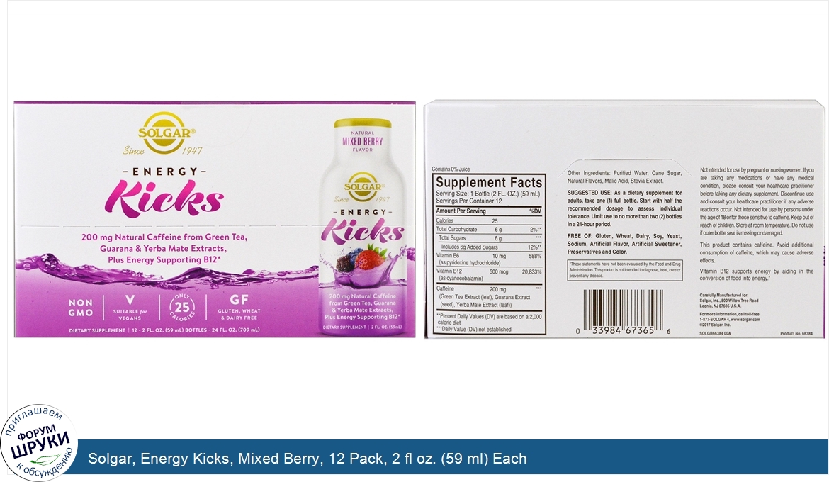 Друзья, если у вас есть отзыв/дополнение/комментарий/вопрос относительно Solgar, Energy Kicks, Mixed Berry, 12 Pack, 2 fl oz. (59 ml) Each - напишите его ответом в эту тему (это будет полезно всему сообществу в целом и вам в отдельности).