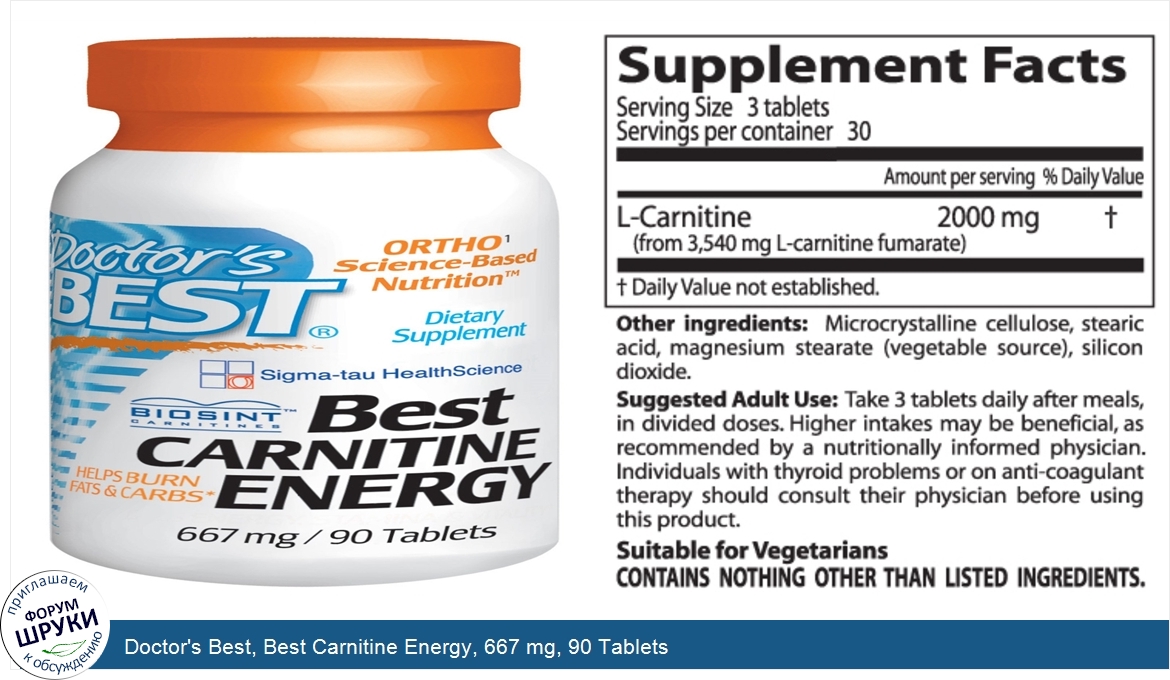Друзья, если у вас есть отзыв/дополнение/комментарий/вопрос относительно Doctor's Best, Best Carnitine Energy, 667 mg, 90 Tablets - напишите его ответом в эту тему (это будет полезно всему сообществу в целом и вам в отдельности).