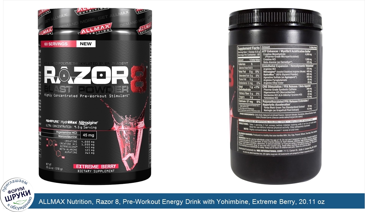 ALLMAX Nutrition, Razor 8, Pre-Workout Energy Drink with Yohimbine, Extreme Berry, 20.11 oz (570 g)