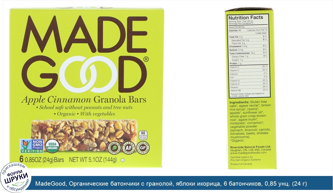 Друзья, если у вас есть отзыв/дополнение/комментарий/вопрос относительно MadeGood, Органические батончики с гранолой, яблоки икорица, 6 батончиков, 0,85 унц. (24 г) каждый - напишите его ответом в эту тему (это будет полезно всему сообществу в целом и вам в отдельности).