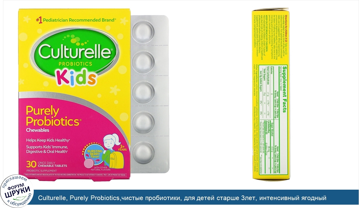 Друзья, если у вас есть отзыв/дополнение/комментарий/вопрос относительно Culturelle, Purely Probiotics,чистые пробиотики, для детей старше 3лет, интенсивный ягодный вкус, 30жевательных таблеток - напишите его ответом в эту тему (это будет полезно всему сообществу в целом и вам в отдельности).