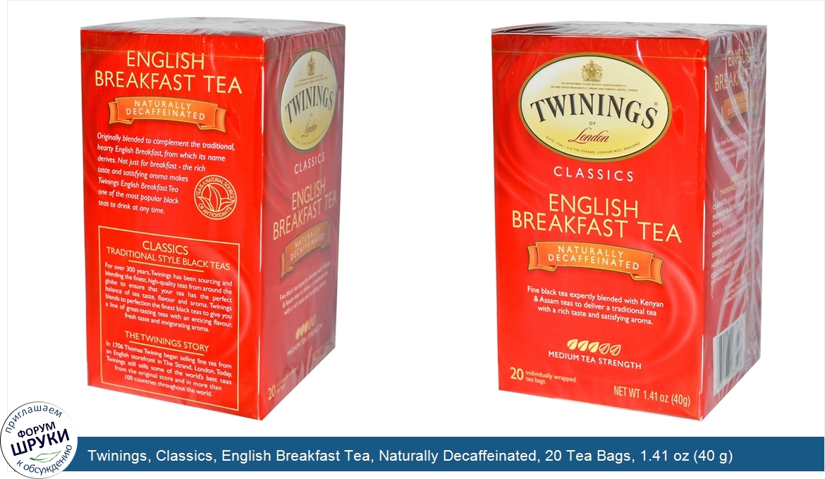 Друзья, если у вас есть отзыв/дополнение/комментарий/вопрос относительно Twinings, Classics, English Breakfast Tea, Naturally Decaffeinated, 20 Tea Bags, 1.41 oz (40 g) - напишите его ответом в эту тему (это будет полезно всему сообществу в целом и вам в отдельности).
