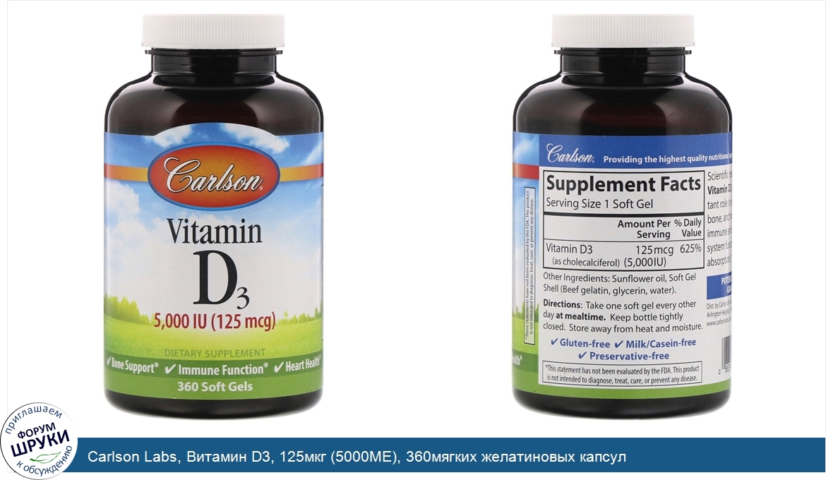 Друзья, если у вас есть отзыв/дополнение/комментарий/вопрос относительно Carlson Labs, Витамин D3, 125мкг (5000МЕ), 360мягких желатиновых капсул - напишите его ответом в эту тему (это будет полезно всему сообществу в целом и вам в отдельности).