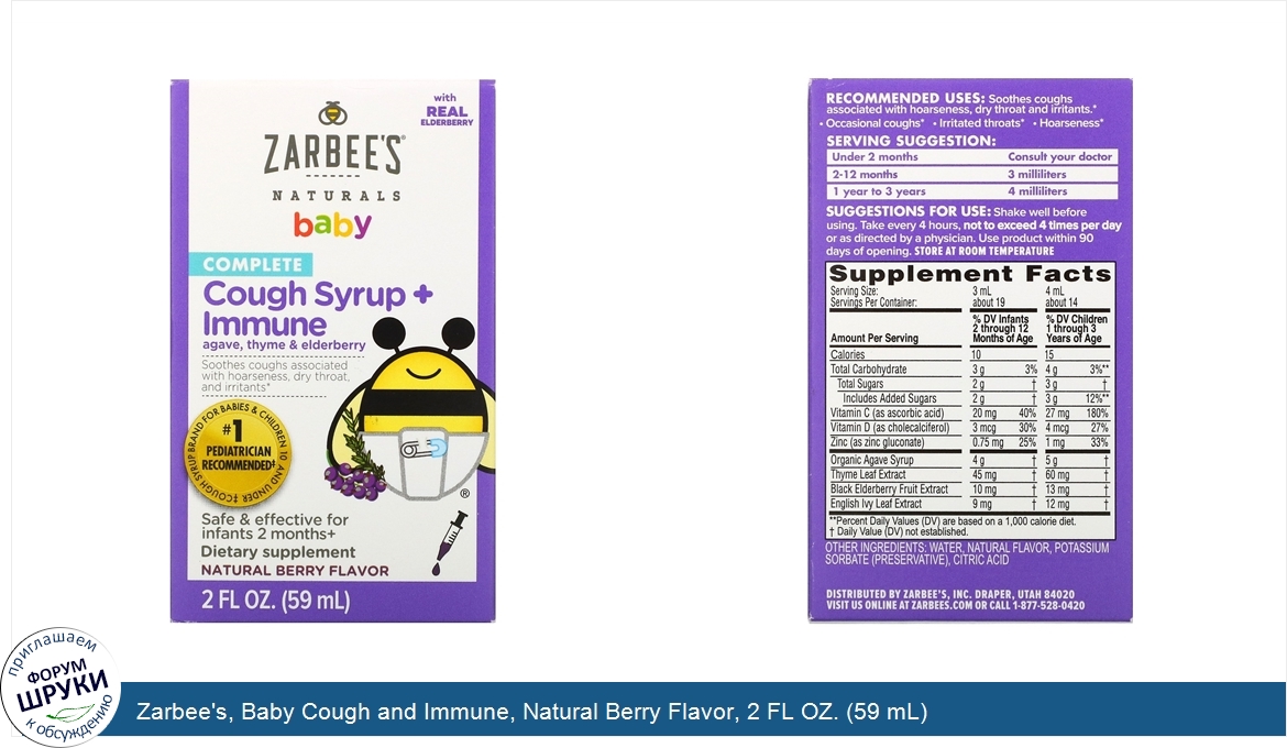 Друзья, если у вас есть отзыв/дополнение/комментарий/вопрос относительно Zarbee's, Baby Cough and Immune, Natural Berry Flavor, 2 FL OZ. (59 mL) - напишите его ответом в эту тему (это будет полезно всему сообществу в целом и вам в отдельности).