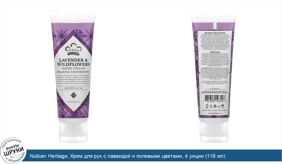 [DESCRIPT]Relaxing Nourishing. Made with Aloe Vera. Certified B Corporation. Cruelty Free. Ethically Traded Ingredients. Sustainably Produced. No Animal Testing. A luxurious nutrient-rich moisture treatment specifically formulated with lavender, cultivated by ancient Arabians as a versatile aromatic botanical with soothing and calming benefits to the senses. Wildflower extract and aloe vera moisturize, nourish and help nurture rough and dry hands. Humble Beginnings: Nubian Heritage is the brainchild of two New York street vendors. In 1992, fresh out of college and without jobs, Rich and Nyema embarked on a mission to produce luxurious natural products from traditional African recipes with fair trade ingredients. Today Nubian Heritage offers culturally authentic natural products inspired by global ancient healing philosophies. Although Nubian Heritage products are no longer made in bath tubs, little else has changed; the company still makes its own products, still uses fair trade ingredients and still invests in community commerce. Heritage: Lavender's use as a versatile botanical essence dates back to ancient times. First cultivated by the Arabians, it is thought to have spread across Europe from the Greek Hyeres Islands. Egyptians, phonenicians and the people of Arabia valued Lavender for its treasured fragrance and remarkable rejuvenating and soothing properties. Reminiscent of lavender and symbolizing growth, our pakage highlights the nourishing properties of ingredients that bloom from the earth.[/DESCRIPT]... (описание дополняется)