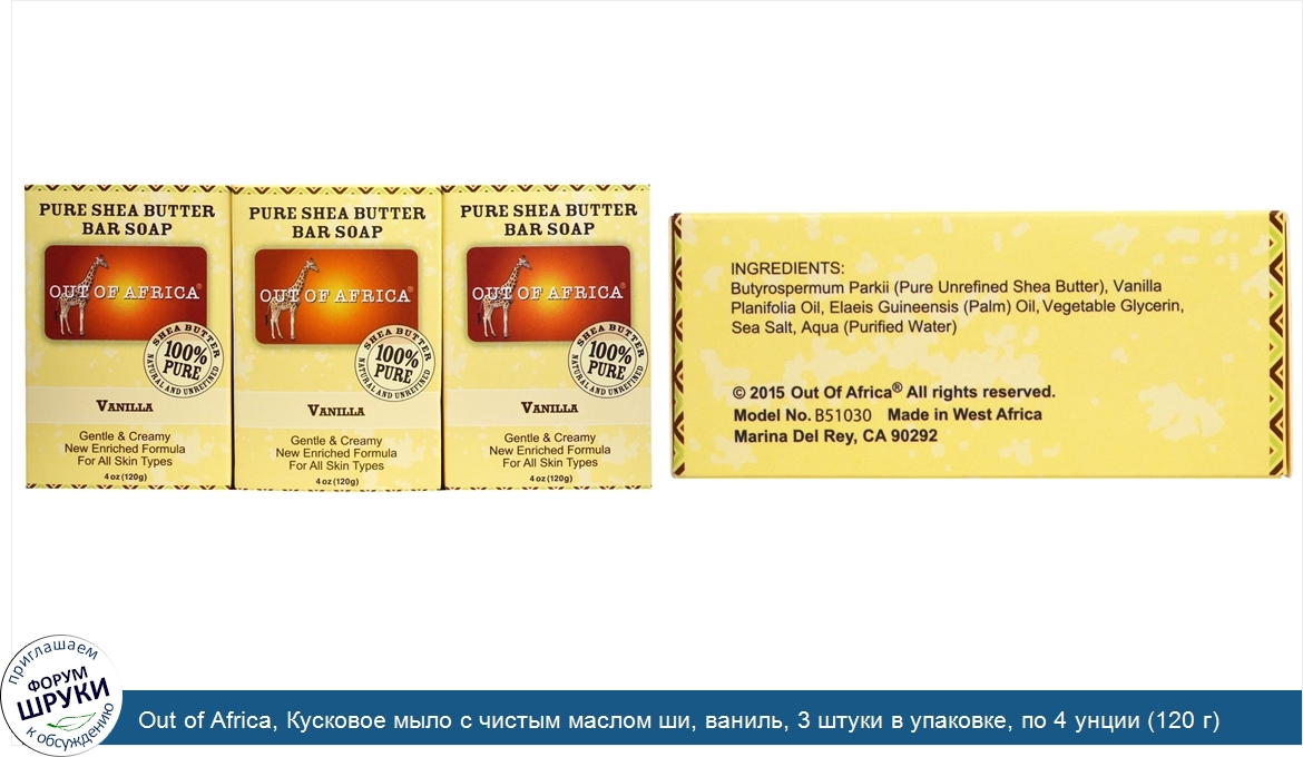 Друзья, если у вас есть отзыв/дополнение/комментарий/вопрос относительно Out of Africa, Кусковое мыло с чистым маслом ши, ваниль, 3 штуки в упаковке, по 4 унции (120 г) каждое - напишите его ответом в эту тему (это будет полезно всему сообществу в целом и вам в отдельности).