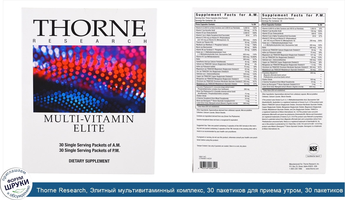 ru Thorne Research, Элитный мультивитаминный комплекс, 30 пакетиков для приема утром, 30 пакетиков для приема вечером