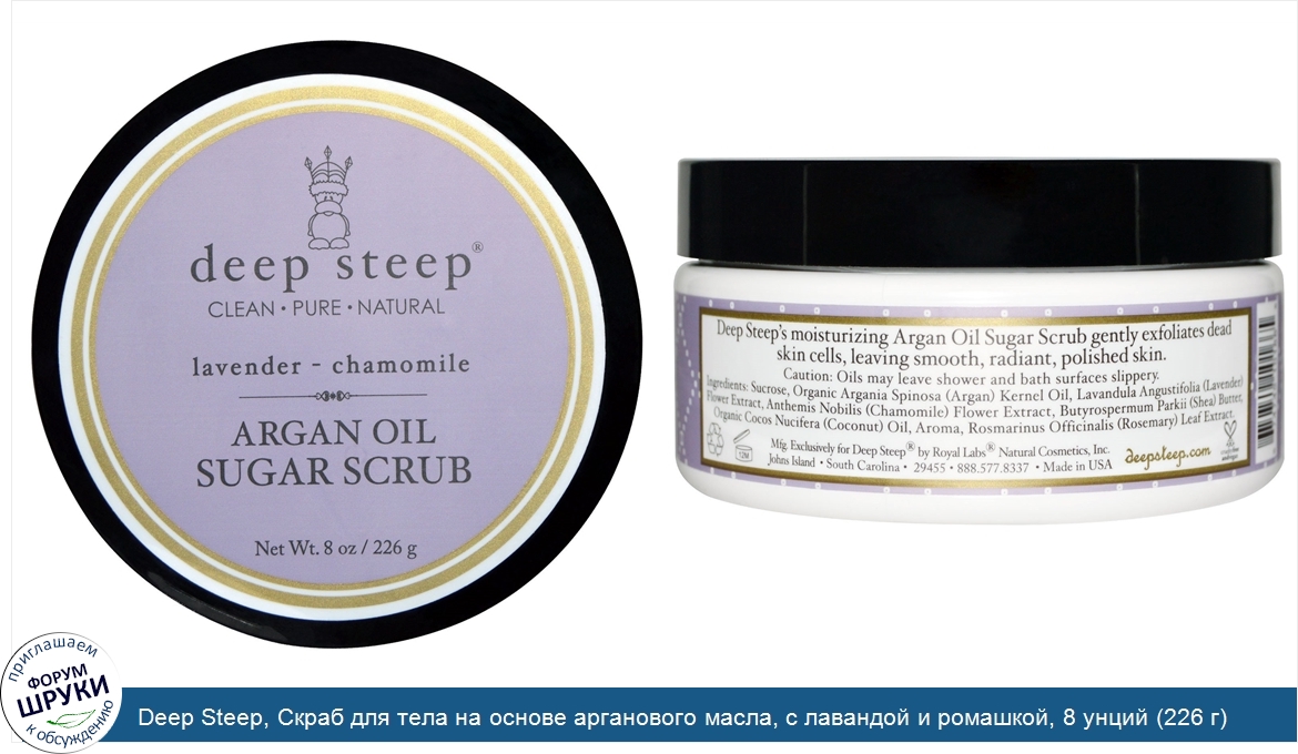 Друзья, если у вас есть отзыв/дополнение/комментарий/вопрос относительно Deep Steep, Скраб для тела на основе арганового масла, с лавандой и ромашкой, 8 унций (226 г) - напишите его ответом в эту тему (это будет полезно всему сообществу в целом и вам в отдельности).